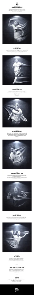 MY ROLE: Team created a new content franchise ‘Monumental Moments’ to appear in the Nike Football App during the 2015 Women’s World Cup. The posts where created using photoshop brushes and filters (created by Carlos Bernal) to alter iconic images from the past and the current cup and produce a thread with the altered image and a GIF of it’s creation. Following the first post that introduced the franchise, we selected a moment from each USA WWC game and had the images approved, illustrated and composed as posts in time to launch in the app before the next game.