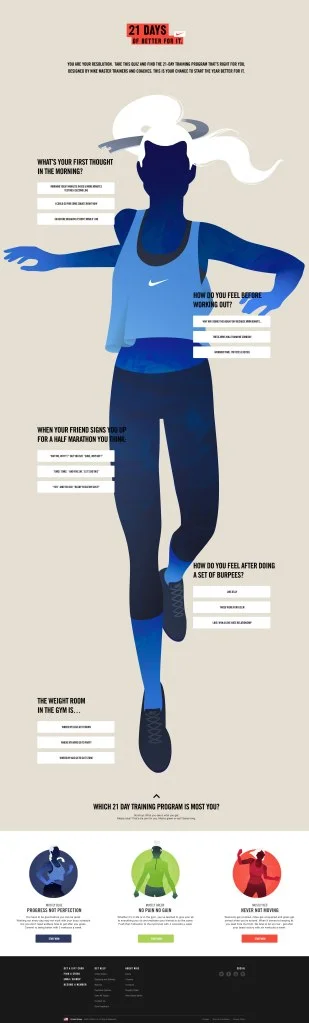 MY ROLE: Produced the creation of a four part quiz to help girls determine what style athlete they where and to get associated gear and training plans. Worked with a Portland based creative team and French artist to create the look and feel and final assets that represented each of our girls. Authored the experience on CQ5 using a series of carousels.