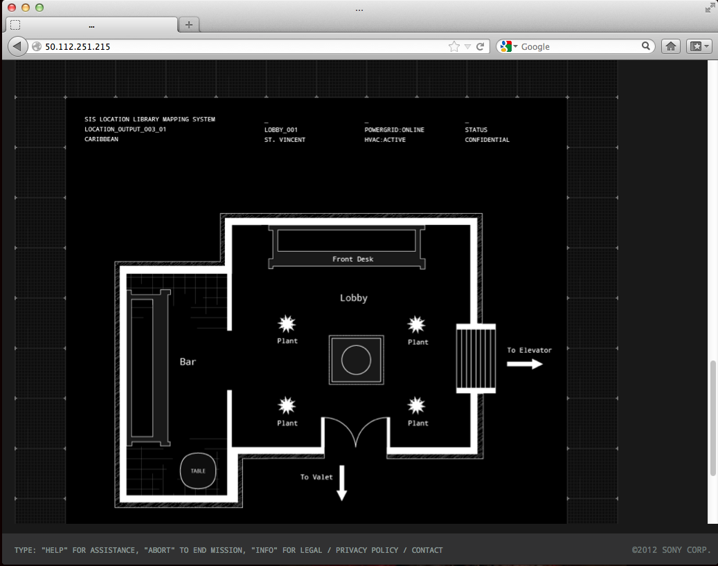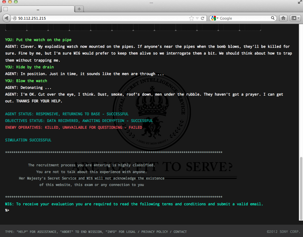PROJECT ROLE: Produced a text based HTML game that could be accessed from any device to promote the tie in between Sony products and the new Skyfall movie. The premise of the game was a british intelligence entrance exam that would determine if the user was fit to serve. we created a chat bot “agent” with thousands of possible responses to interact with the users. The game was pre-seeded to a group of influencers who received audiorecorders that allowed them to unlock the site by playing a specific audio key. The average time spent by players who completed the game was 4 hours and there where over 300k unique visits despite no paid media other then a single Reddit ad.